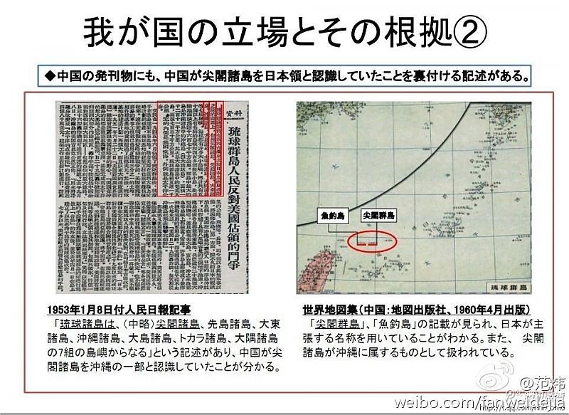 近日,日本政府决定使用1953年1月8日的《人民日报》作为论据,指出中国曾承认尖阁诸岛为日本领土的消息风靡网络。目前,日本外务省已在其官网上刊登了相关文章的照片,并注释“可见中国曾将(钓鱼岛)视为冲绳的一部分”。报导称,日方将在与各国首脑及外相的会谈中主动提及上述内容,并将通过互联网强化信息发布,以期积极对外宣传。 看看耄都干了些什么啊!