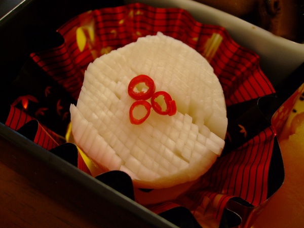 2.将大头菜切成条,用盐腌一下,然后快速洗掉盐分,挤干水份,连同海带和辣椒放入三杯醋汁中腌24小时后,盛在盘中,撒上柚子皮即成。