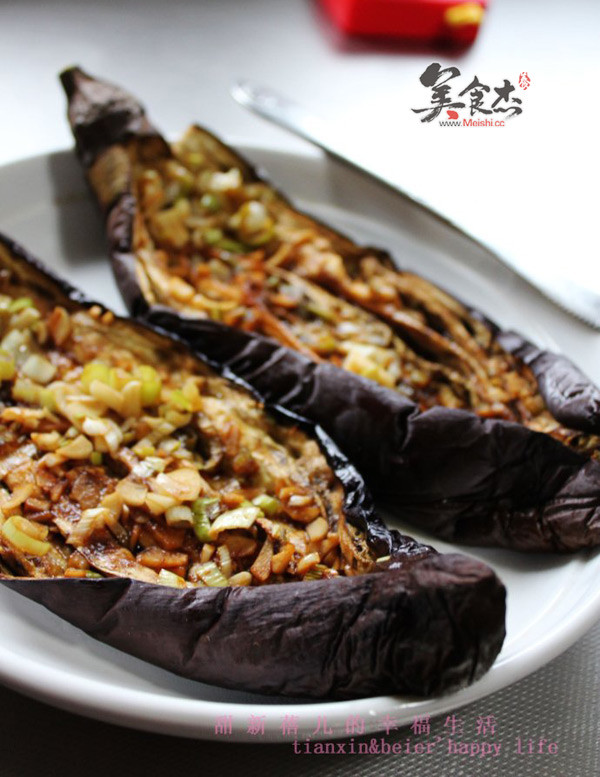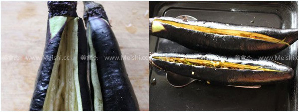 3。两个剖面各浅浅的划上几道,以便入味均匀的倒入茄子切开处