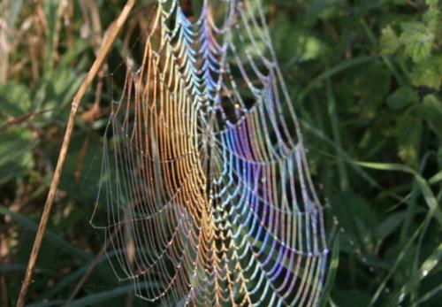 8、蛛网上的露珠形成“露虹” 蛛网上的露珠形成“露虹” 当潮湿的空气中漂浮着许多小水珠时,有光线穿过就会形成彩虹。标准的彩虹并不少见。但如果太阳光线的角度较低,而且小水珠又都粘附于某特定表面时,也会出现一种特别的彩虹现象,即所谓的“露虹”。比如,蛛网上的露水就会形成所谓的“露虹”,小草、野花等植物表面为“露虹”形成提供了很好的平台。