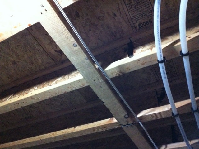 pigcheng 说: 地下室顶部怎么上drywall?joist下面有电线,一根木条,水管,铜管(如图)。 点击展开... joist下用2x3,跟你图一上的1x3一个方向。12~16“间隔。 2x3有1.5”高,一般的东西都可以了。实在不行只有移水管了。