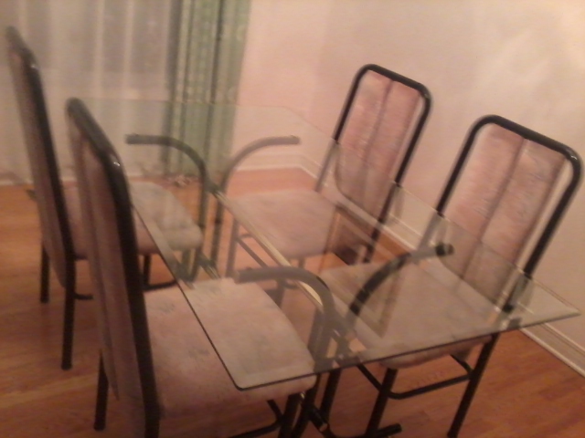 for the best offer 要价180$,价钱不是问题,若喜欢可谈加,任何合理的还价 都不会拒绝。 桌椅整体质量非常好,新的当时税前400多 桌子153X90 CM,设计简洁美观,用料很好,heavy duty钢架,非常坚固,很容易拆装。 加厚玻璃