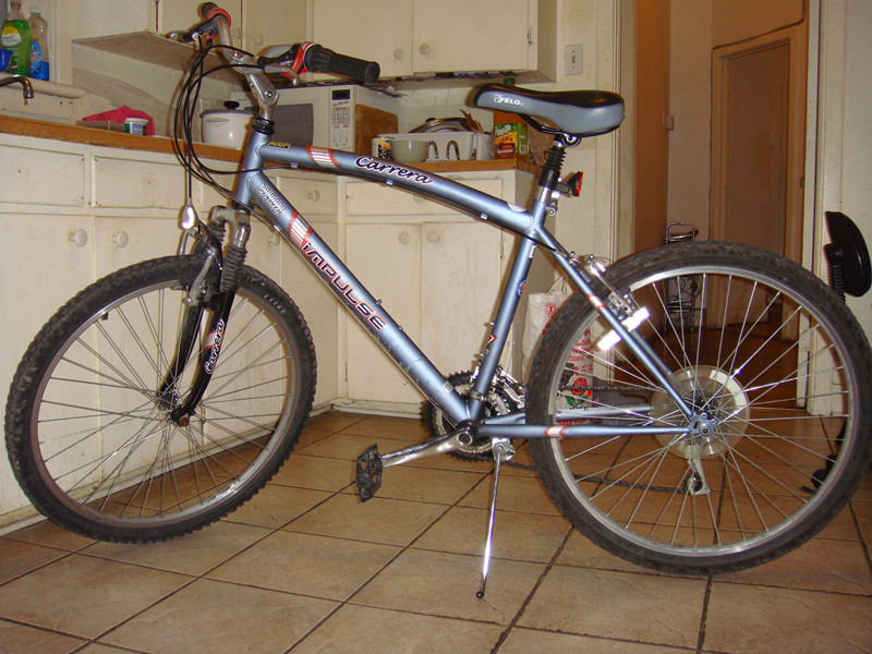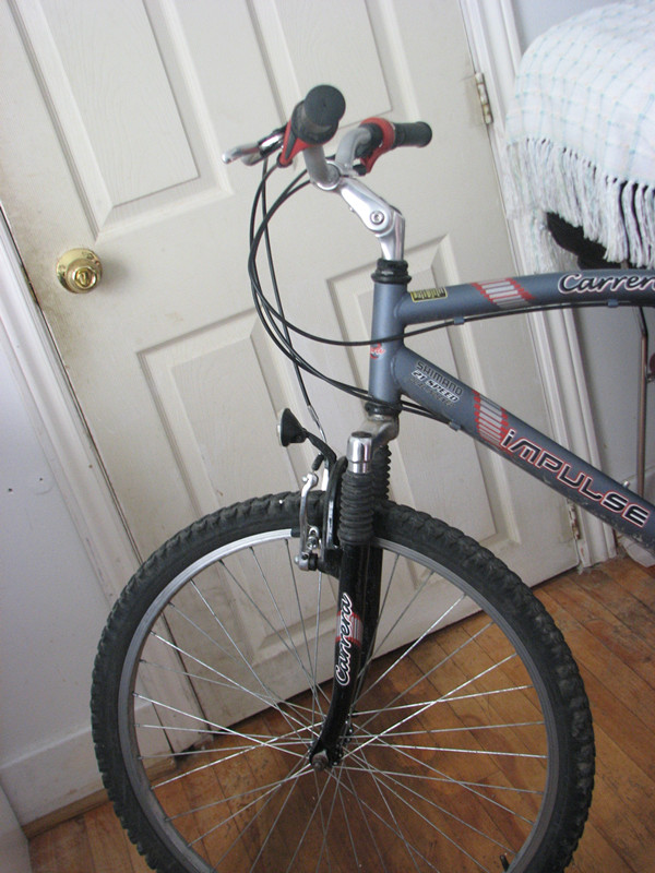 蓝色:26轮胎,9成新,前轮和车座双减震,骑行非常舒适,换挡、刹车轻便灵活,报价80刀