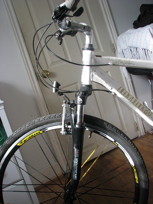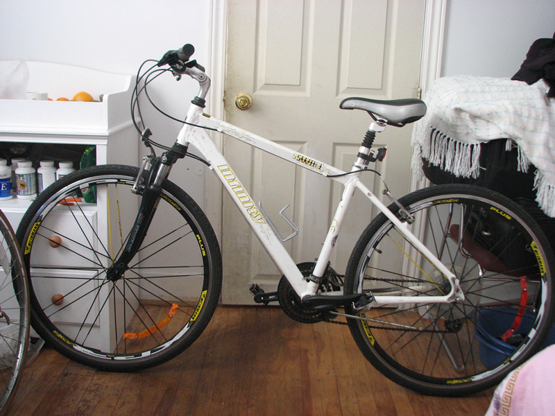 白色:28轮胎,8成新,前轮和车座双减震,骑行非常舒适,换挡、刹车轻便灵活,报价70刀