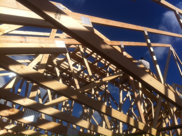 accord500 说: truss低下是大rywall,上面是OSB或plywood,再上面是屋顶材料。 之间纵横交错,有的板是临时干活用的。所有的结构工程师会来按照truss图每根检查,还检查他们之间的连接和固定。 看看我家的truss 点击展开... 你家的用plywood吗?