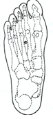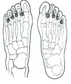 部位 位于双足底第一跖骨与第二跖骨之间以及第一跖骨远侧部连成带状。