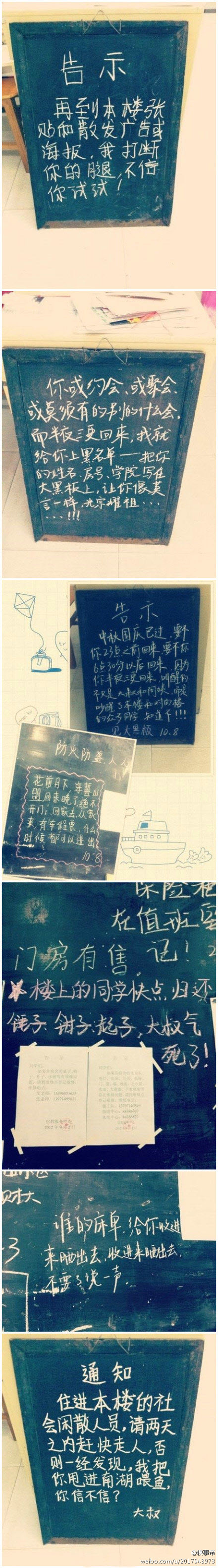 最近中南财经大学一位看门大叔走红网络。他通过门口的小黑板跟住在本楼的学生们交流,喜笑怒骂之间霸气尽显,超萌的语录更是引得网友围观,不断赞叹:这大叔太霸气了,有木有?