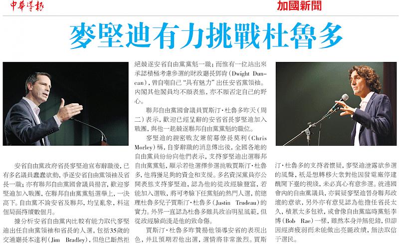 中国人 说: 该报处心积虑地将两位加拿大著名政治家在不同场合的毫不相干的照片移花接木,硬性拼凑在一篇稿件中,故意制造竞选骗局,侵犯特鲁多先生和麦坚迪先生肖像权,性质极其恶劣. 点击展开... 呵,这个就有些勉强了。