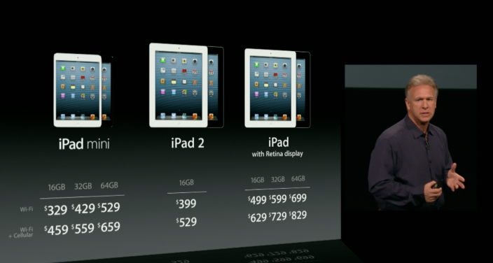Today's fourth-generation iPad unveiling was accompanied by Apple's announcement of the long-awaited iPad Mini. That device comes with a 7.9-inch screen and is notably thinner and lighter than Apple's larger tablet. The iPad Mini will retail at a starting price of $329.