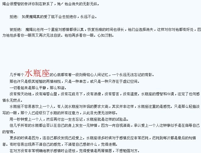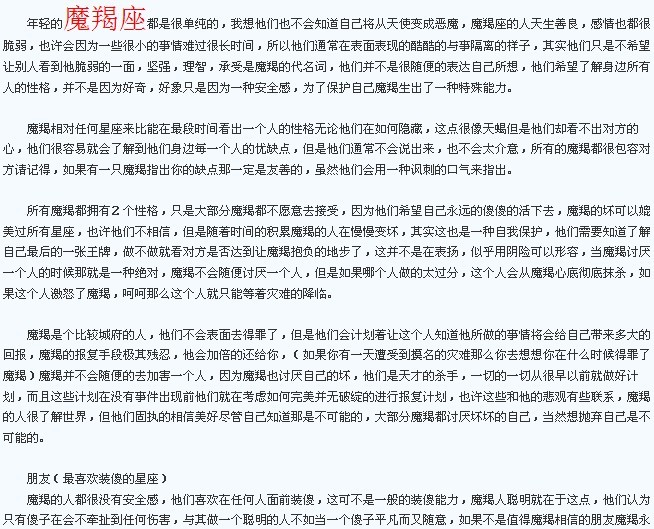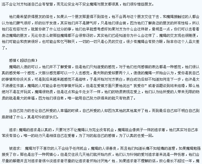 偶最亲密的一个哥们是摩羯,偶记得他对偶的一句评价是,偶是用偶的不认真在掩饰偶的认真,而偶对他的一句评价是,他是用他的认真在掩饰他的不认真。 摩羯男是很有领导力,很有团结力,脑子极好用,做事情能算尽每一步,如果摩羯男动坏脑子,他有这个脑力,恒心,持久度执行到底。他喜欢领导和掌控,但其实摩羯男心里并不是真在意这些东西,摩羯男只是需要这样的一个外在形象来达到对自己的认可。 摩羯男一旦爱一个人是痴心一生的,彻头彻尾的,但绝对不死缠烂打的。