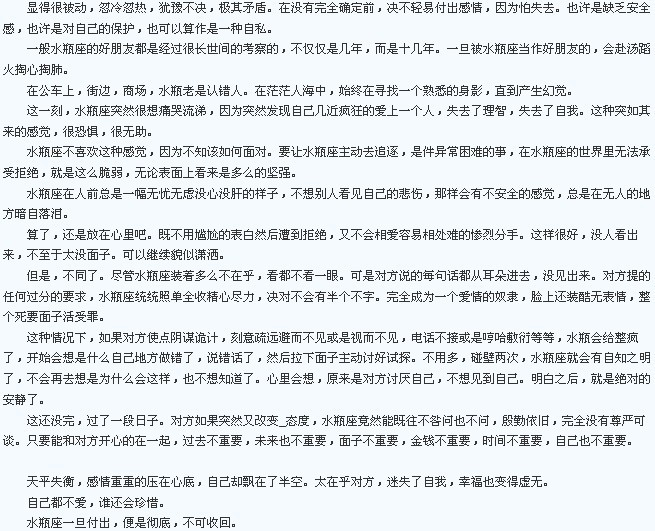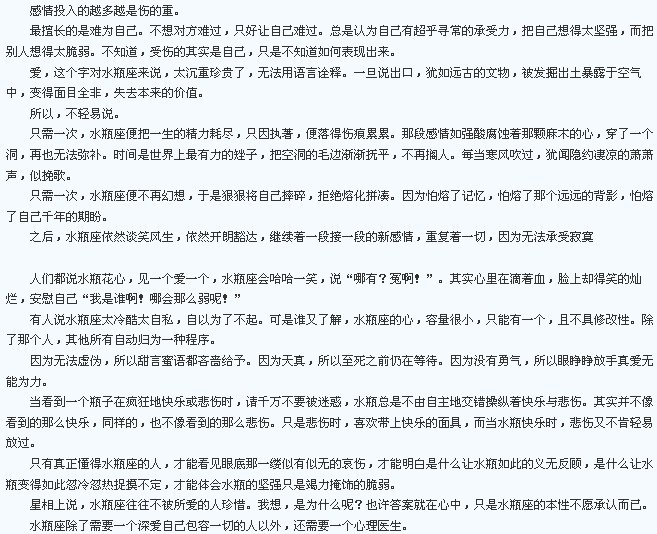 精灵精灵 DRAGONLORD 管理成员 VIP 注册 2012-02-09 消息 14,890 荣誉分数 7,245 声望点数 293 2012-11-26 #51 水瓶偶只认识几个女生,都是很温柔,很会照顾人,可以为家庭牺牲很多。肚子里想法很多,表达出来的不多,不是热情似火的,更算细水长流的。