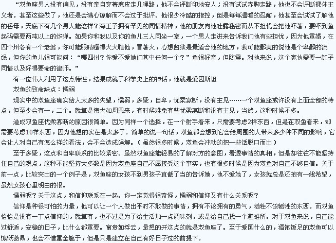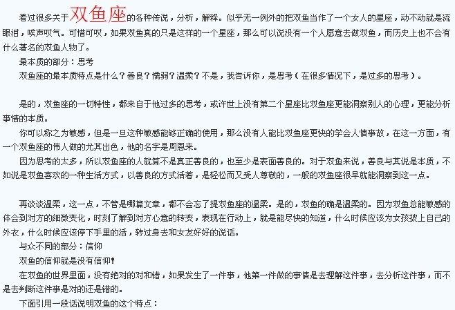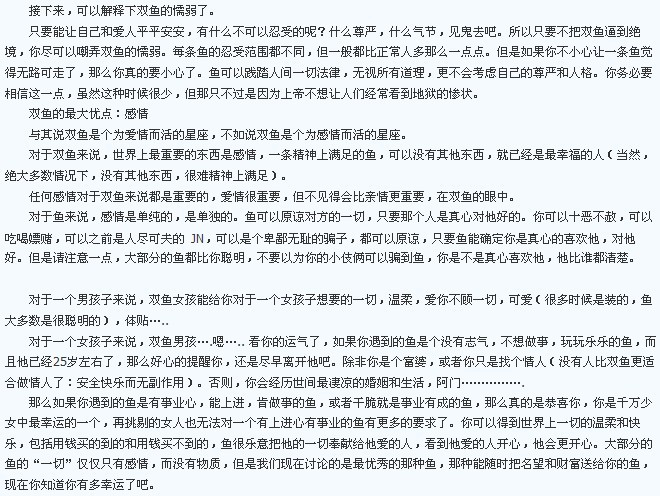 精灵精灵 DRAGONLORD 管理成员 VIP 注册 2012-02-09 消息 14,890 荣誉分数 7,245 声望点数 293 2012-11-26 #58 双鱼应该是三个水象星座里,最柔和的一个星座了,其实他不像水,更象水里的一条鱼,与世无争,温柔,平和,不急不缓,不起不伏