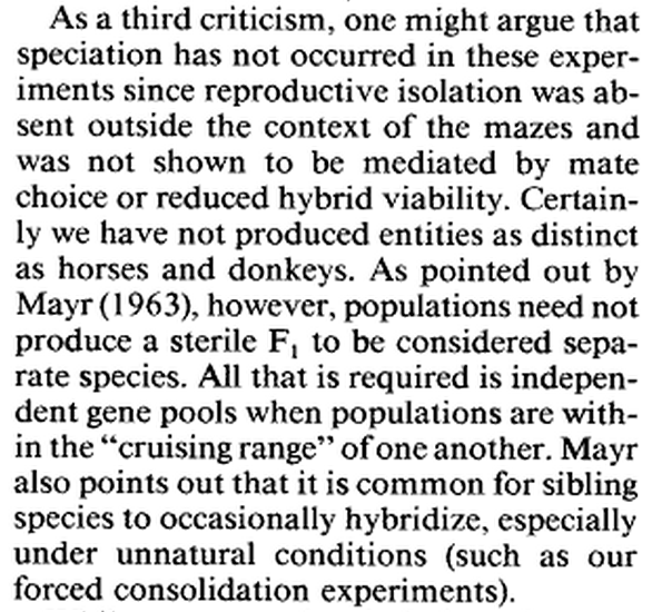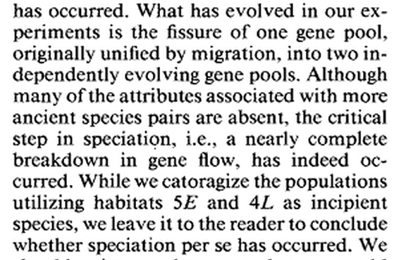 “It might be argued that incipient speciation has not occurred in this experiment for two reasons. First, trace amounts of gene flow occurred between the population using habitats SE and 4L, since a small fraction of flies switched habitats between generations. Because small amounts of introgression are frequently observed in natural sibling species without species status being invalidated, this objection is unwarranted. "