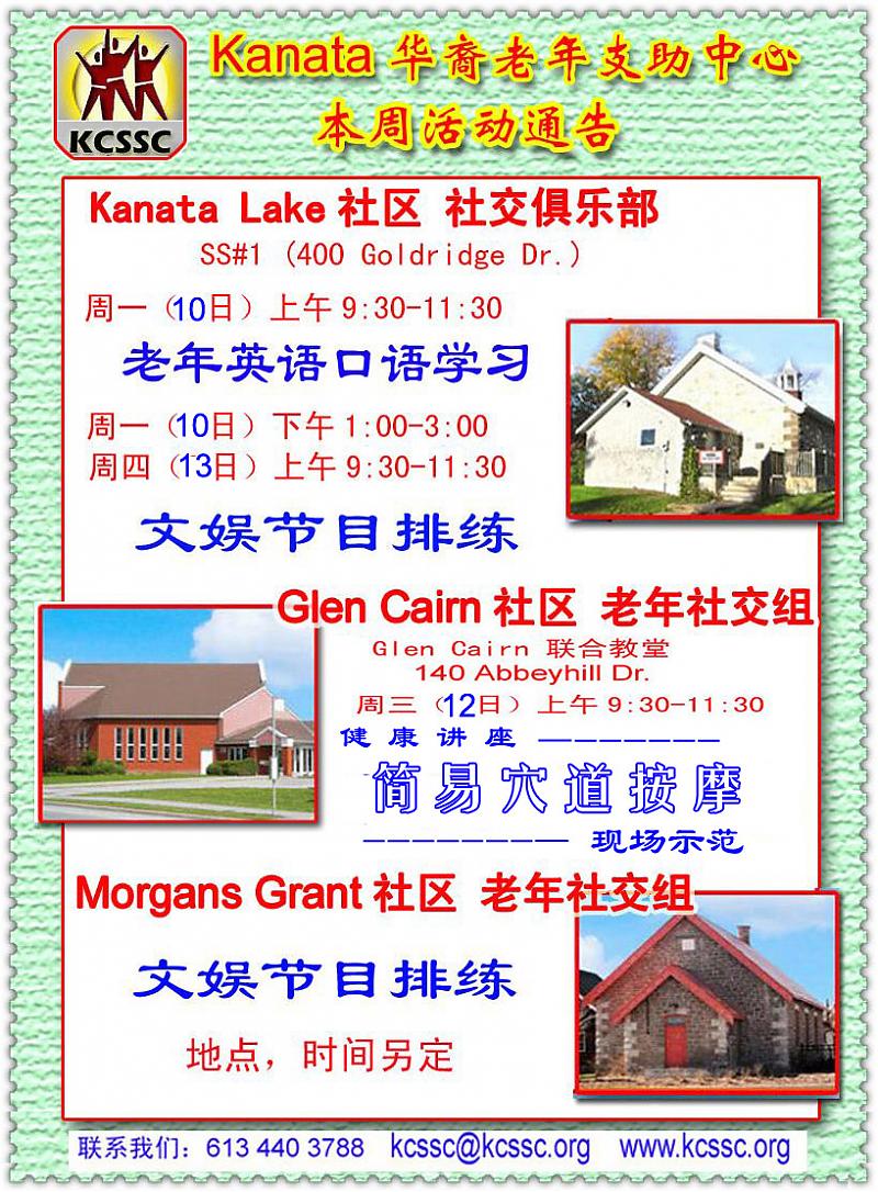 十二月十二日(周三)健康讲座: 冬季保健,简易穴道按摩 - 杨华强先生 9:30-11:30am 140 Abbeyhill Drive 公车118到Hazeldean商场,再沿着Abbeyhill路走进来,约5分钟。