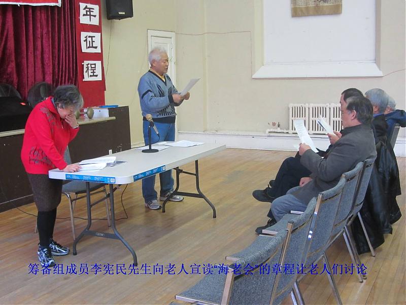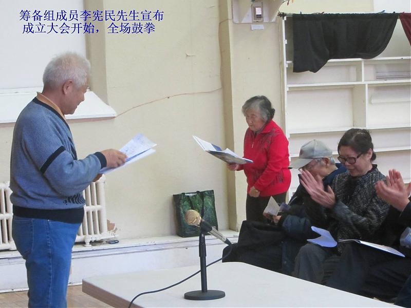 渥太华《海外老年华人联合会》,简称为“海老会”,经过几个月的筹备,终于在12月12 日上午加华文化中心小礼堂举行成立大会。参加大会的60岁以上的老年华人达70余人,小礼堂座无虚席。与会嘉宾有加华文化中心理事周树邦先生、安福园家庭服务部主任冯基堡先生、加华文化中心副主席王里柱先生、华联会副主席赵以强先生、华人社区服务中心总监耿静惠女士。上午十时大会开始。主持人李宪明先生代表筹备组庄重地宣布成立大会开始,老人报以热烈鼓掌。钱天维女士就会“海联会”名称作了说明后,李宪明先生接着宣读《海外老年华人联合会章程》(草案),让老人们讨论通过,然后进行理事会选举,产生7名理事,宣布渥太华《海外老年华人联合会》正式成立。“海老会”成立,百花园中又一朵鲜艳花朵绽开了,可喜可贺!