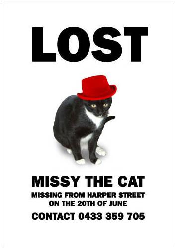 I opened the screen door yesterday and my cat got out and has been missing since then so I was wondering if you are not to busy you could make a poster for me. It has to be A4 and I will photocopy it and put it around my suburb this afternoon.