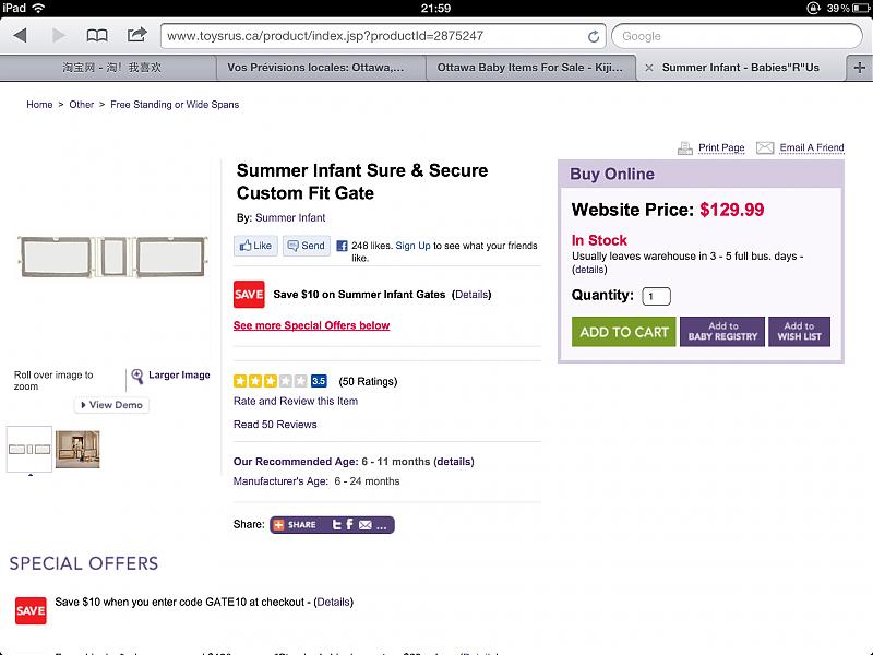 summer infant sure secure custom fit gate : 130$+tax 2010年底买的