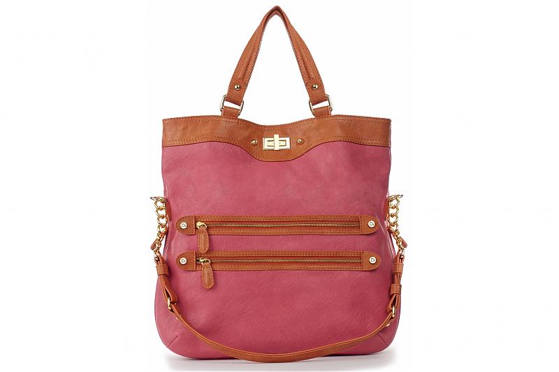 short handles as well as a chain-detailed strap. A zip-around gusset expands to maximize carrying capacity.