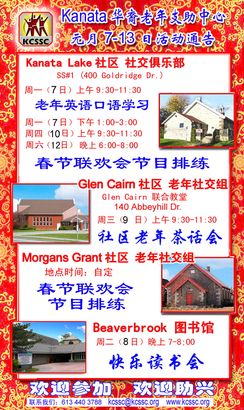 Kanata华裔老年支助中心一月7七至十一日活动通知