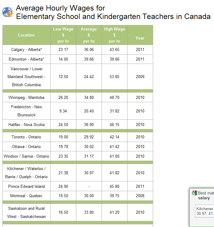 The OECD also calculated the salary per hour of teaching time after fifteen years of experience. The OECD average is $49 for primary teachers, and $65 for secondary. In the U.S., the figures are much lower, at $41 and $46 respectively. The Canadian figures? For elementary teachers $68 an hour, and for secondary $74. Gulp.