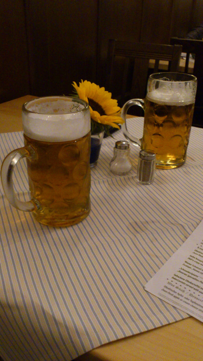 月下独酌 说: 说起这个我个搞笑的事情 到了慕尼黑那天晚上去Lowenbrau吃完饭。德国都是自己入座。。所以找了个好位置往下一坐,就过来个德国大妈,一句英文不懂,说了半天,我也不懂,就伸出两根手指 我一看,没错啊,这不俩人么,速度点头,大妈就满意的走了。我老婆说,恩,好像不对啊,刚才她貌似说了bier (beer....) 端上来两升啤酒。(老婆酒量就是一口倒的那种) 点击展开... 看着图片就馋他们的啤酒了。