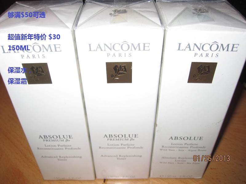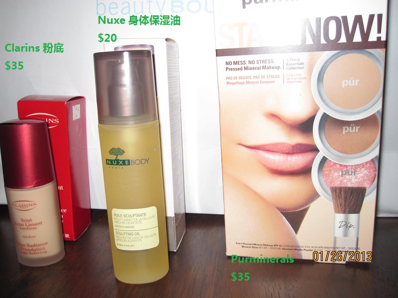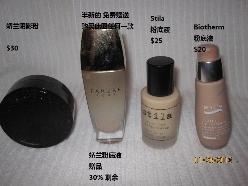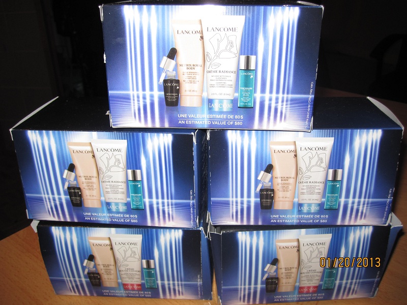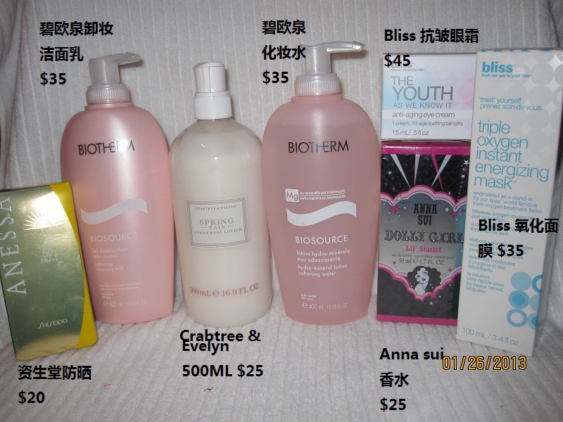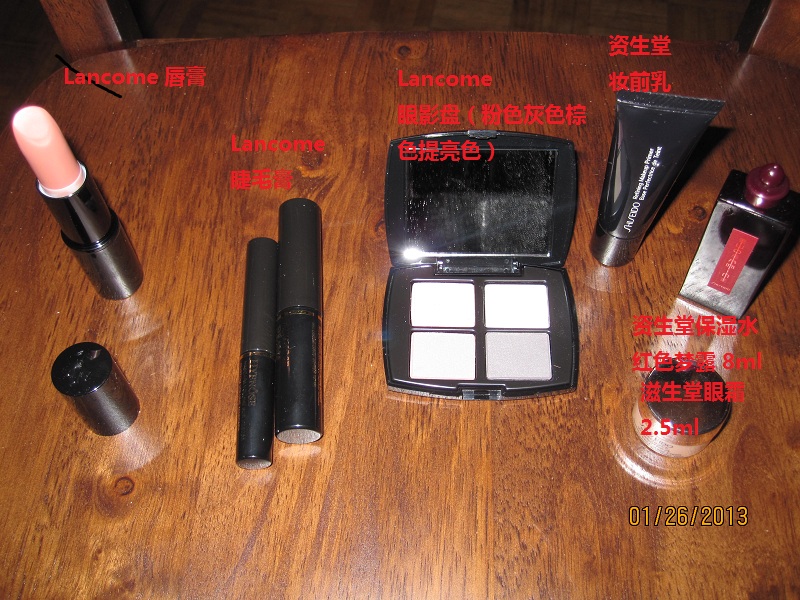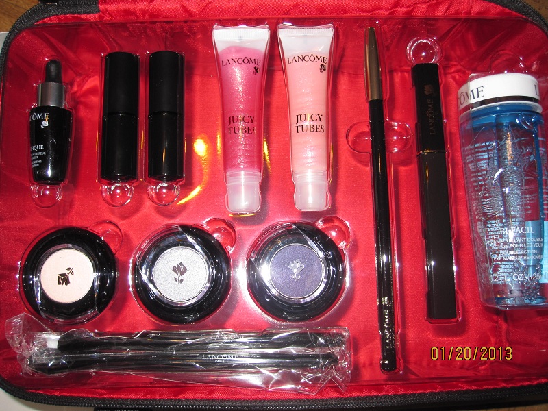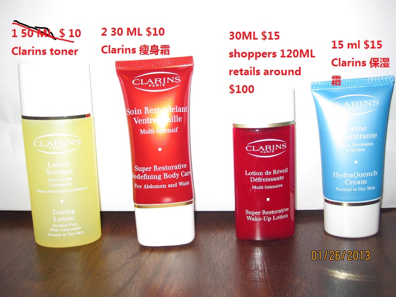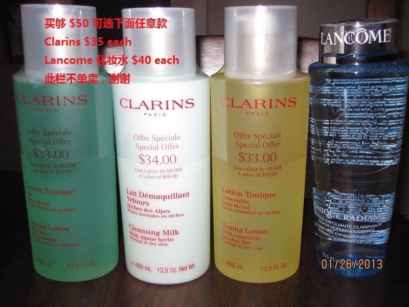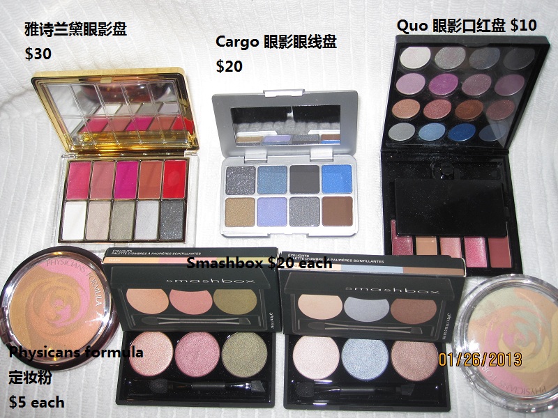 lancome 图中,眼影 $15 each, 卸妆水 $20, 唇彩唇膏眼线笔 $10, 睫毛膏$15,刷子2把 $10, 精华液 $10 (这组中最低买够$30)