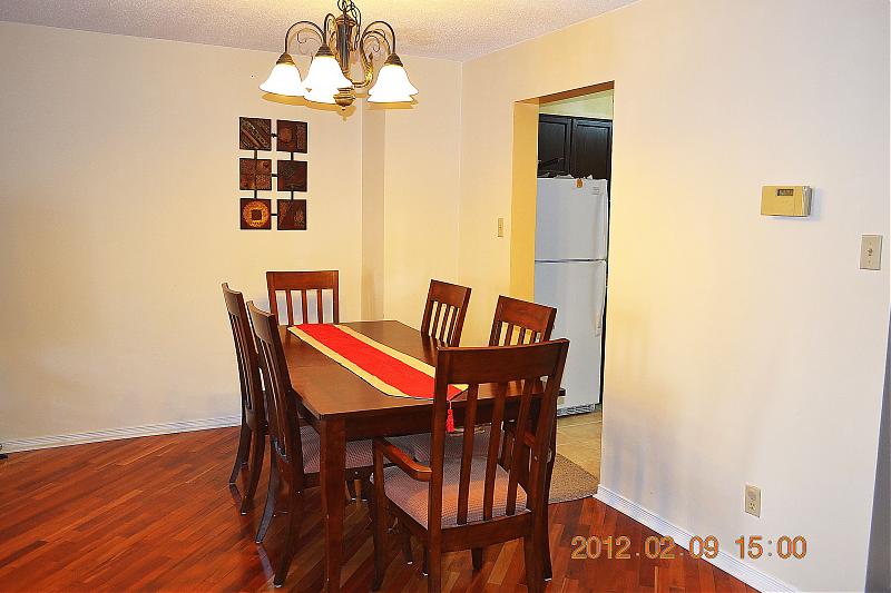 -Diagonally laid cherry hardwood flooring in living and dining room