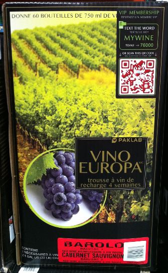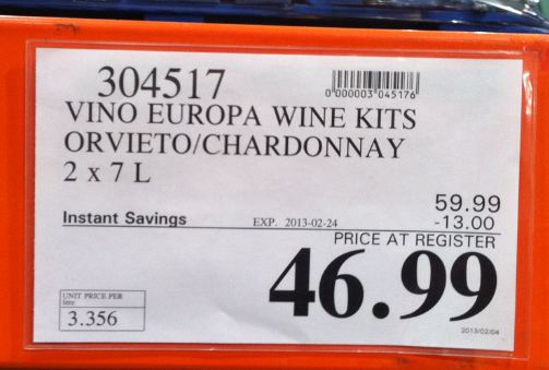 上周去了Costco Nepean(1849 Merivale Rd, Nepean, ON K2G 1E3),看到了特价的Wine Kit,标签儿原价$49.99,降价$13后是$36.99。当时我问了一下店员里面有没有发酵用的瓶子carboy,回答说是没有,我就想等我把瓶子搞定了再来买。