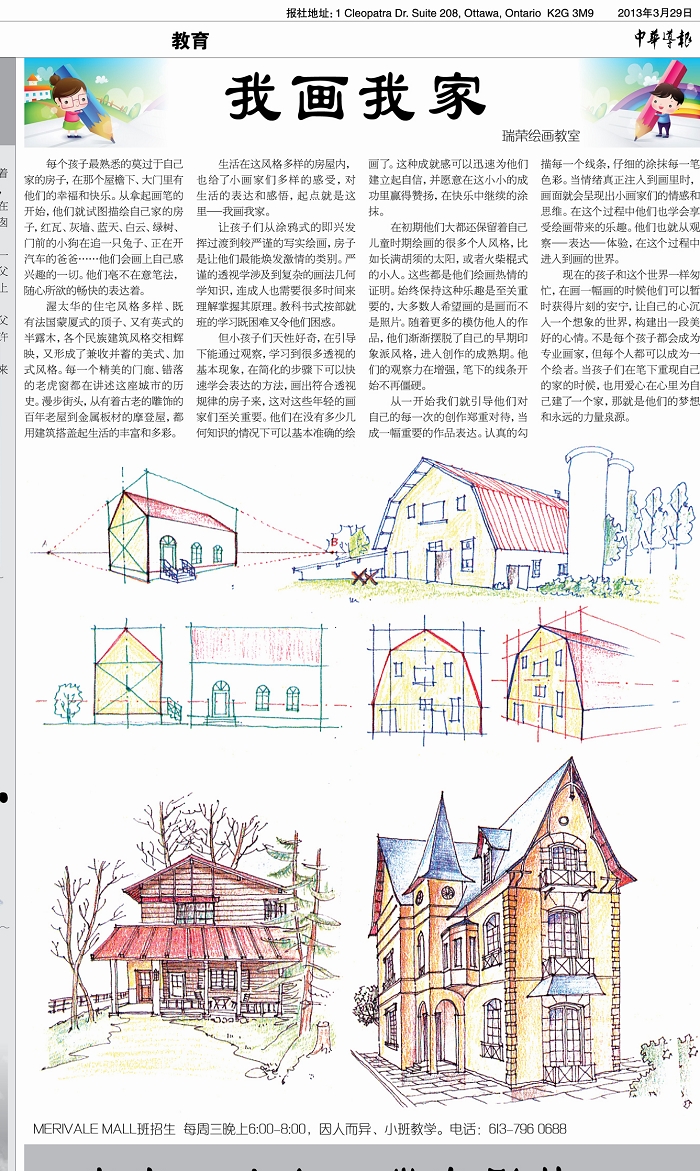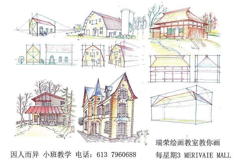让他们从涂鸦式的即兴发挥过渡到较严谨的写实绘画,房子是让他们最能焕发激情的类别。严谨的透视学涉及到复杂的画法几何学知识,连成人也需要很多时间来理解掌握其原理。教科书式按部就班的学习既困难又令他们困惑。
