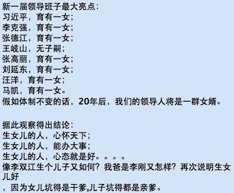 lifeisfun 本站元老 VIP 注册 2003-03-09 消息 7,345 荣誉分数 1,027 声望点数 373 2013-03-21 #2 问题是那女婿也是哪家的儿子,所以还是生儿子好。可以将主席的女儿拿下, 再接老丈人的班