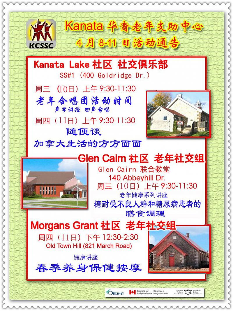 KCSSC 新手上路 注册 2011-07-13 消息 452 荣誉分数 9 声望点数 28 2013-04-08 #1 补遗: Kanata Lake地区 社交俱乐部 星期一(8日)上午9:30-11:30 是老年英语口语学习班 欢迎参加!!! 附件 20130408-11 活动通告.jpg 199.2 KB · 查看: 126