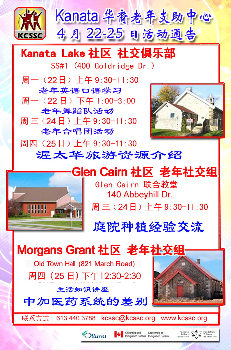 Kanata华裔老年支助中心四月22日-25日活动通知