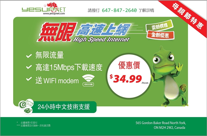 无限光纤上网,特价优惠 无限流量 高达15M下载速度 24小时中文激素支持 [FONT="幼圆"]送WiFi Modem[/FONT] [FONT="幼圆"]优惠特价$34.99/月[/FONT]×此优惠需一年预付 ×此优惠需支付$99一次性激活费