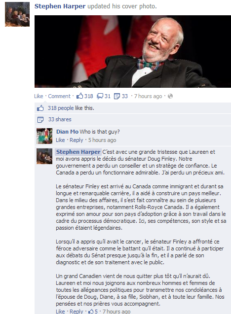 他是刚过世的Laureen参议员道格·芬利。我感到非常悲伤。我们的政府失了顾问和战略家。加拿大已经失去了一个美妙的雇员。我失去了一个亲爱的朋友。