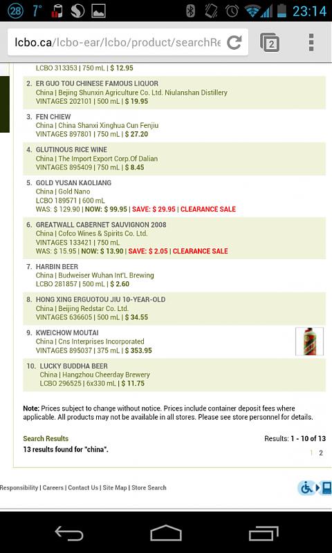 谢谢。我今天去那个LCBO了,没看到有中国的白酒卖啊。只有青岛啤酒和两种日本清酒。