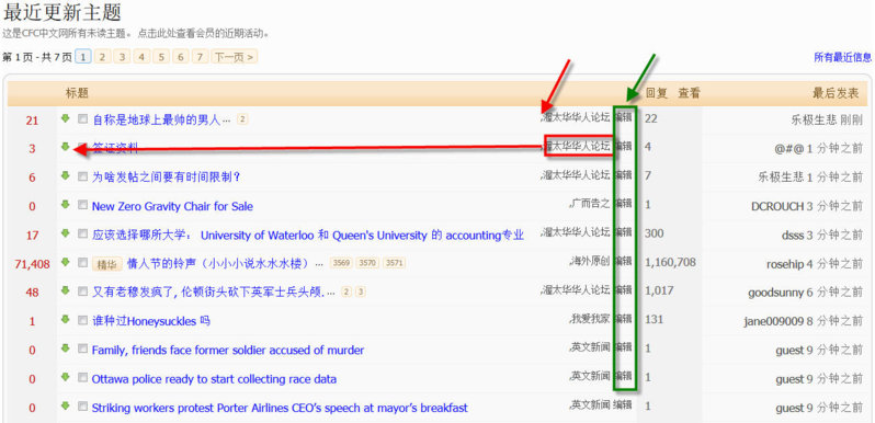 heureux 说: 最新消息下 1. 现在开头是个 逗号 了 2. 最好把版面名(比如 渥太华华人论坛) 提前 到 主题名前,这符合阅读习惯 3. 每行都有个 编辑 二字,最好搞个漂亮的 ICON 代替 浏览附件327409 点击展开... 哈,我还没有进来过。 “回复”应该在前面第一栏;现在“回复”下面的数字应该是“查看”,应移除“回复”;“论坛”放在那里还可以,须拿掉那个逗号;那个“编辑”,我看不到了。呵。