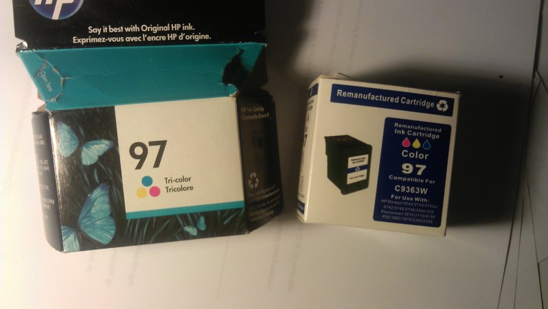 first one: original genuine second one: re-manufactured both are open package, but never used with full ink bought them for my printer, but it turns out my printer has bad color ink cartridge slot. they are over $40 for one in store