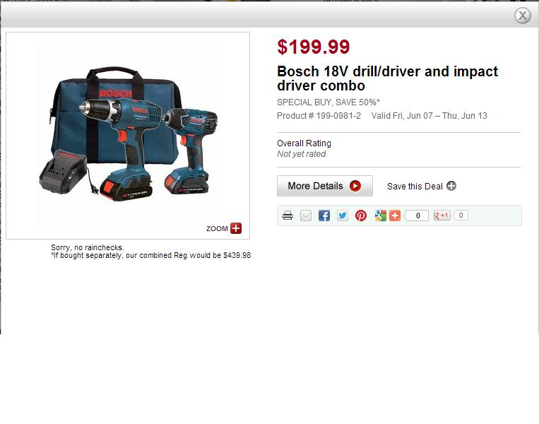 CT这套BOSCH的18V DRILL/IMPACT DRIVER COMBO也应该算是个DEAL。。换钻的可以考虑。。