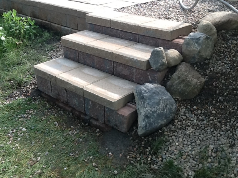 台阶也太短了,换cap,用两个两尺长的cap。由patio的高度反推第一级地基的高度。第一级也太高了,下面的草皮也该整平点,你也不怕把腿抻了。