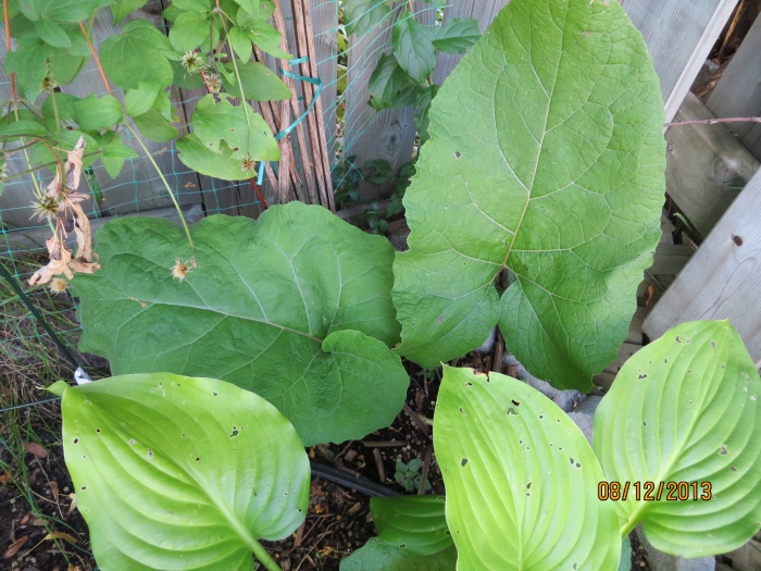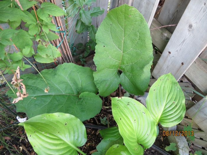花园角落处有一棵叶子好大的植物,见照片。请大家帮忙看看,这是啥植物,不认识,最怕有毒植物。谢谢。