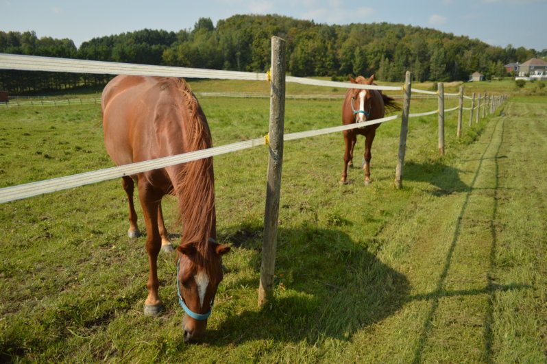 但后来我知道我的担心是多作的,因为当我拍摄它们时,碰到了这两条白色的带子,然后感到有一阵微弱的电击的感觉,原来通了电的,应该是为了防止马儿逃跑吧。