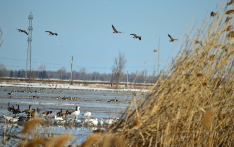 冬天终于过去了,不会再下雪了吧开车在401上,忽然看到路边的田野一群群的大雁,把车停车路边上,放下车窗,只听到一阵阵“嘎。。嘎。。嘎。。”的雁叫声传过来,那些白色的应该是加拿大雪雁吧。