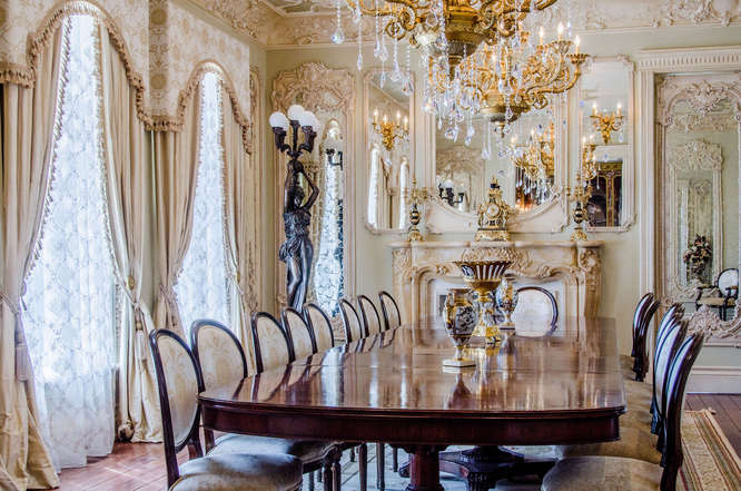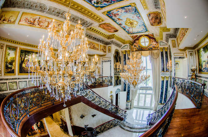 该 豪宅占地2.4万平方尺,拥有6间卧室、12间卫生间、巨大的前厅与室内泳池,长长的车道可供30辆汽车停放。大量豪华的装饰、吊灯、壁画将宅邸衬托得富 丽堂皇。这对夫妇称,他们在法国凡尔赛宫相恋,在宫廷般的露台上完成誓言之吻成为彼此的愿望。于是自己投资修建豪宅用作婚礼的举办场所,所有嘉宾也都穿着 18世纪风格的服饰出席他们的婚礼。而婚礼完成三月后,这座豪宅便被挂牌出售。