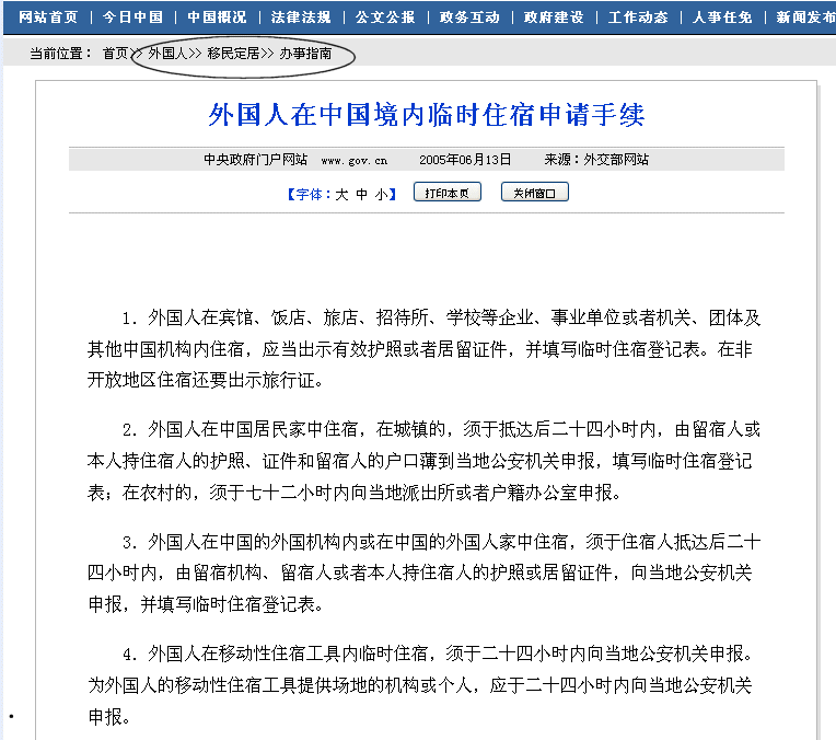 外国人在中国的外国机构内或者在中国的外国人家中住宿,须于住宿人抵达后24小时内,由留宿机构、留宿人或者本人持住宿人的护照或者居留证件,向当地公安机关申报,并填写临时住宿登记表。