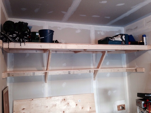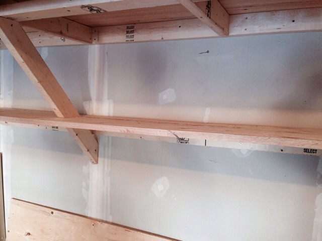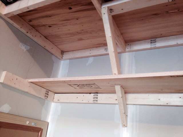 设计上,这个架子肯定不能占有floor space,开始考虑是仅一层shlef, 10'宽,32"深。用三角做支撑,(也可考虑挂在天化板的joist上)。后来突发想出在下面又加一层10'x16"的shlef。3/4”厚的4'x8'的plywood锯成32"和16”宽,正好分别用在上面和下面。