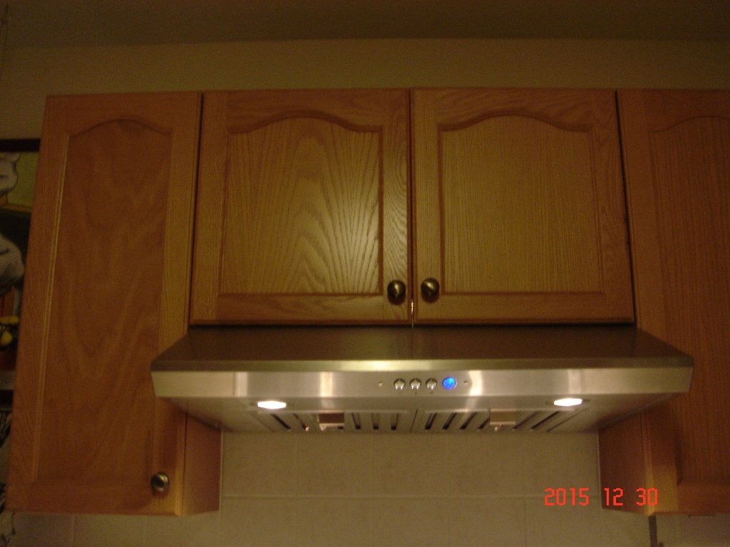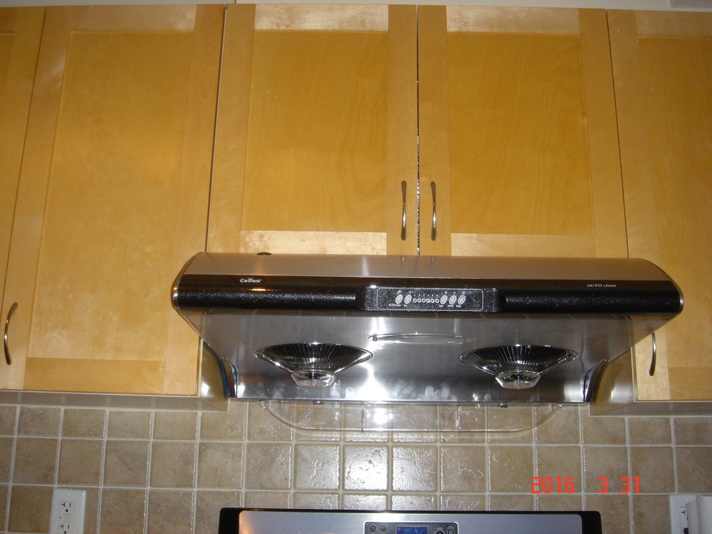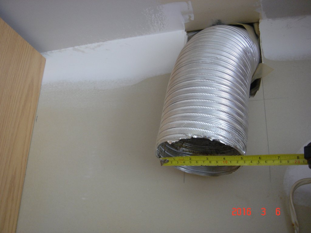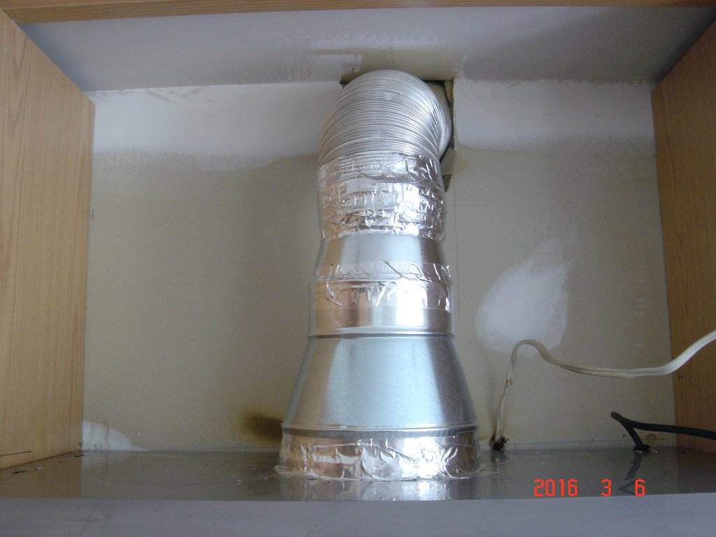 今天施工了一款难度相当大的油烟机安装,油烟机排风出口8英寸,管道入口4英寸,有高度要求,而且前面还有橱子,要在这样的情况下安装好,而且不能影响橱子的使用,施工用了4个多小时,终于安装好了,达到了用户的要求。见附图。