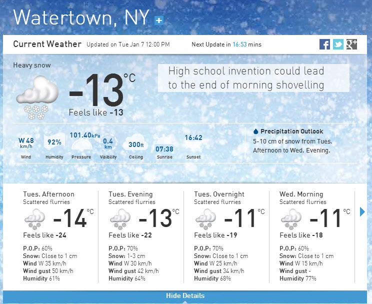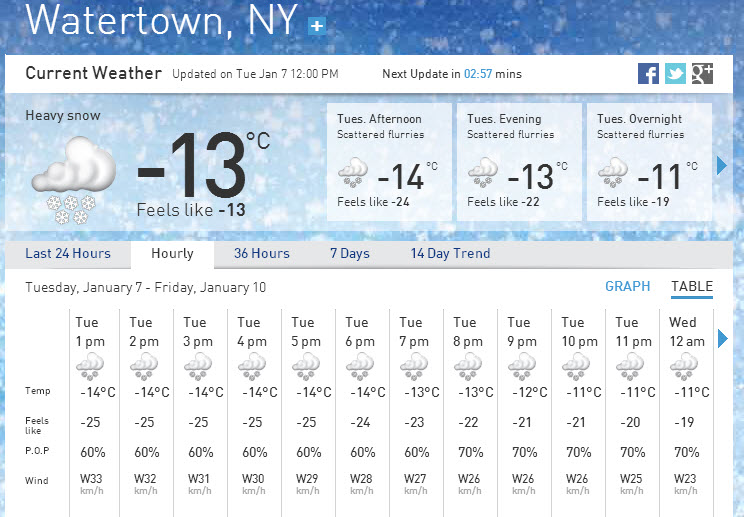 当晚Watertown零上5度,Syracuse零度,下雨,风呼呼叫。