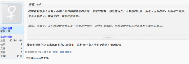 某某 说: 无视,无所谓,就是最好的办法。 有些人,越理他越来劲。 点击展开... +++++ 最敬佩CFC上的曾经的一个ID,SHOPPINGCART,当时,大概是因为观点不同,被几个ID不堪的骂脏话,围攻,人家理也不理,该起楼起楼,该回贴回贴,那份淡定透着的一股极度的藐视,其实,那是比任何回骂更给力,但这不是人人能做到,也不是人人都能懂,估计有人还以为是人家屈了~~ 这样的ID见过几个,不多,只是对TA的印象最深~~