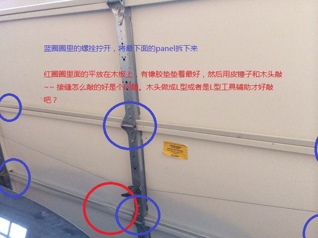 我没有photoshop 软件,不能在你的照片上做标记。你下面第二张图上中间有4个螺钉的地方是合叶。拿掉上下各两个螺钉, 合叶就拆开了。你的车库似乎是单门。所以应该每节panel 有三个合叶。都拆开收好。你撞击的地方似乎是最底下一片和倒数第二片。但是要把门拆下来,可能得把4片都拆开。一片一片从轨道顶部拿出来。