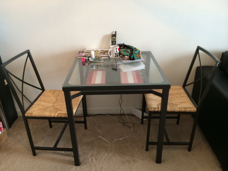 11. 玻璃餐桌加2把椅子1套,购于ikea,9.5新,无任何缺损,$60转。SOLD